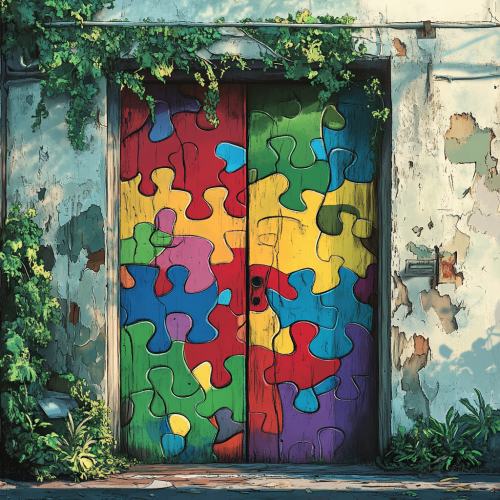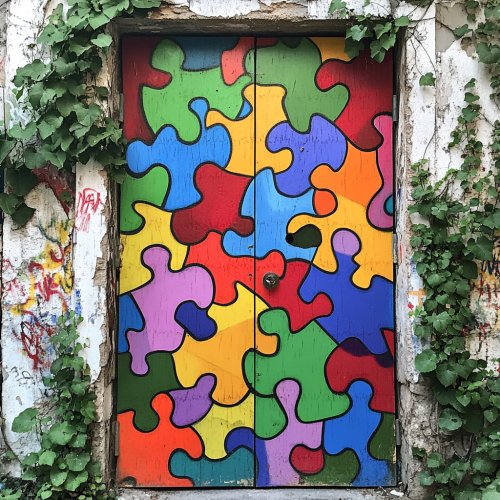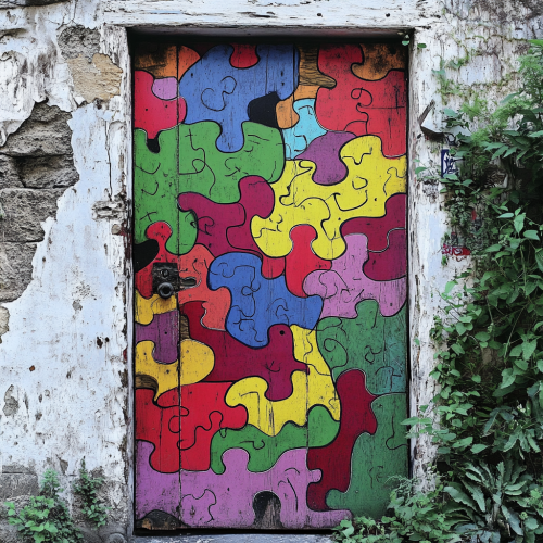 an animation drawn in the style of studio, Ghibli and artistic hand painted door with large interlocking puzzle pieces in bold vibrant colors like red, green, blue, yellow and purple the puzzle pieces have fluid abstract patterns blending colors. The door is set against a weathered off white wall with peeling paint and surrounded by green plants, the urban decay meets playful whimsical Street art, captured detailed and textured scene