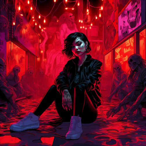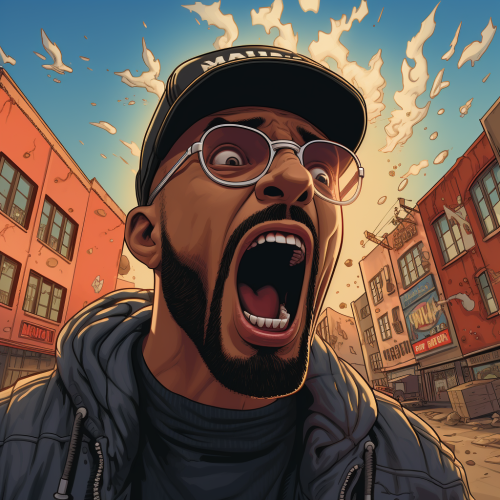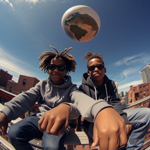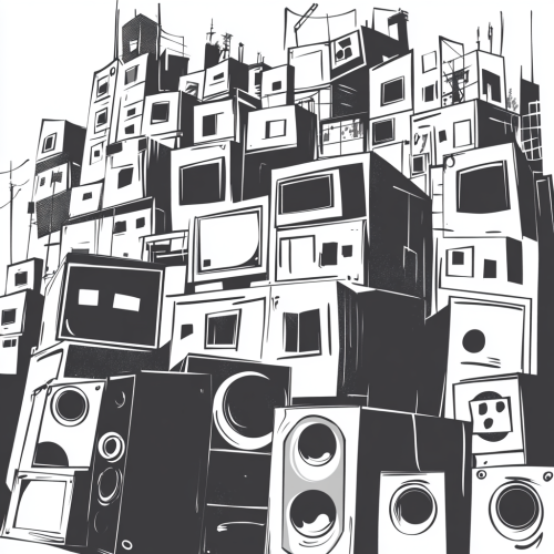 I need a black-and-white realization vectorized from the blocks of houses that I've queried, a bit graffiti style with people and thick bass speakers in the foreground below