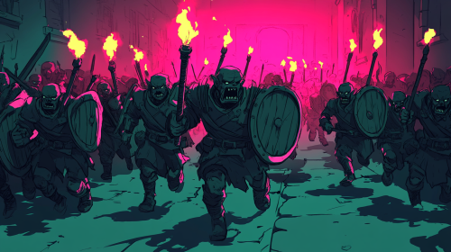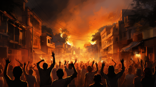 Illustration of angry rioters raising their hands and clubs along an inner south indian city street, a fire in the background, ultra realistic, hd, real --ar 16:9 --s 250