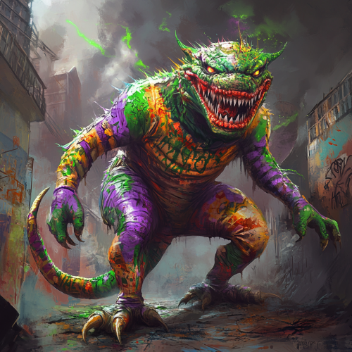 A gigantic, biological fusion of Joker and Godzilla, with a monstrous, reptilian body covered in a patchwork of bright, chaotic colors and patterns. The creature has a wide, unsettling grin with sharp, jagged teeth, and its eyes gleam with a maniacal green glow. Its claws are long and twisted, and its tail is lined with spiked protrusions. The creature's body is marked with vivid, graffiti-like splashes of purple, green, and orange, mimicking Joker’s iconic look. The background is a dystopian Gotham City, with chaotic streets, crumbling buildings, and a sky filled with swirling dark clouds and eerie green lightning, creating a nightmarish and anarchic atmosphere.cinematic,high quality.