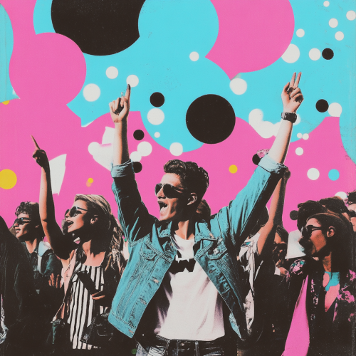 generate a simplistic minimalist collage, inspired by pop art and kusama. the subject is: street protests for transgender rights. vibrant flat three tone colors with a color palette of: pink and blue and black. multilayered, retro, creative and artistic --v 6.1