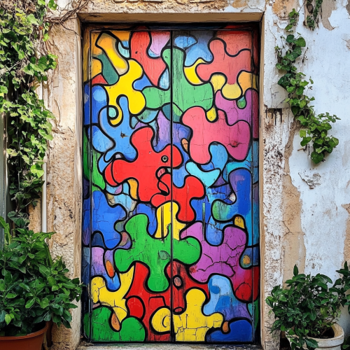an animation drawn in the style of Studio Ghibli of an artistic handpainted door with large interlocking puzzle pieces and bold vibrant colors like red, green, blue, yellow and purple puzzle pieces have fluid abstract patterns with the edges of the puzzle pieces are not defined, and they slightly blur into each other. The door said against a weathered off-white wall with peeling paint and surrounded by green plants, urban decay meets playful ones a street art captured in the detailed and textured scene.