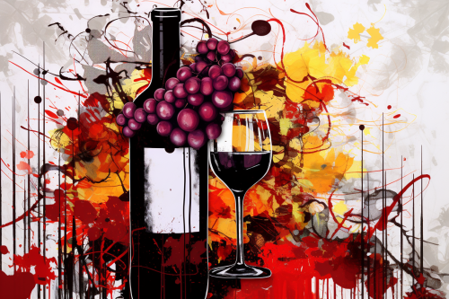 copyrighted image, abstract art grafitti design with drippings, there's a bottle of wine and glass of red wine and bunch of grapes in the center --ar 3:2