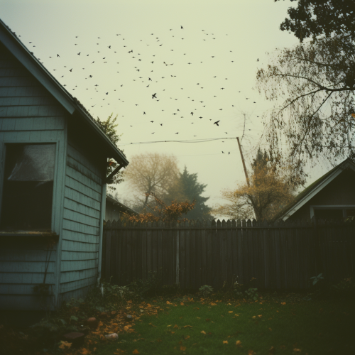 analog photo of american backyard in the hood, rainy day, sad mood, birds flying in the sky, dust, grain, grunge. Use a old school analog camera for a vintage flavor , evoking a sense of mystery and dedication.