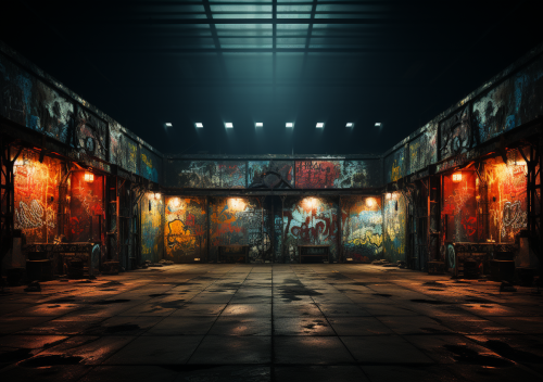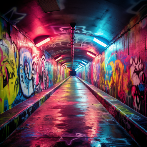 concrete tunnel with graffiti . Water in centre channel. Vibrant colours. Wall lamps.