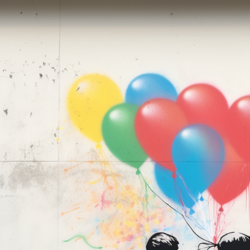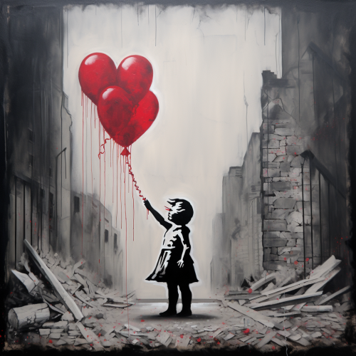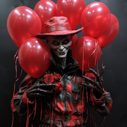 hyper realistic, HD,3d,32k of Freddy Krueger holding red balloons in Banksy style, intricate details