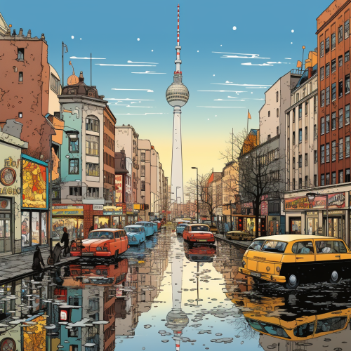 comic art scene of the city of East Berlin Germany in the late eighties, playful, tidy and accurate for the era