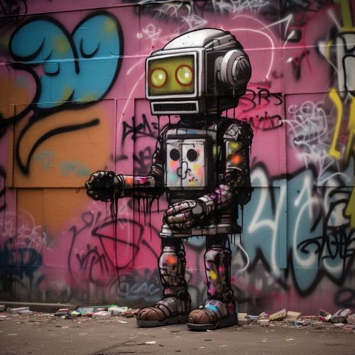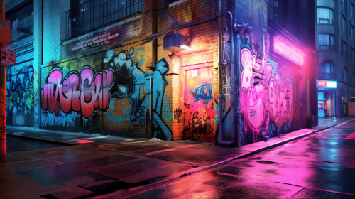 Central Urban Canvas: A vivid urban wall, awash with graffiti that embodies a cyberpunk essence. Medium: Digital Photography. Style: A fusion of contemporary street art with the neon-tinged, dystopian ambiance of cyberpunk aesthetics. Lighting: Ambient city luminescence accentuated by neon highlights that make the central graffiti pop. Colors: Deep urban shades juxtaposed with radiant neon blues, purples, and pinks. Composition: The heart of the image should spotlight a striking piece of graffiti, perhaps a cyberpunk-inspired mural or emblem, ensuring it remains the focal point. This central element should be surrounded by slightly dimmer, yet still detailed, graffiti to ensure that when resized for mobile (750x400 pixels), the core visual remains undistorted and is the primary attraction. The mural's vibrant colors and intricate design should draw the viewer's eye immediately, making it the undeniable centerpiece of the image. --ar 16:9 --v 5.1 --style raw --s 750