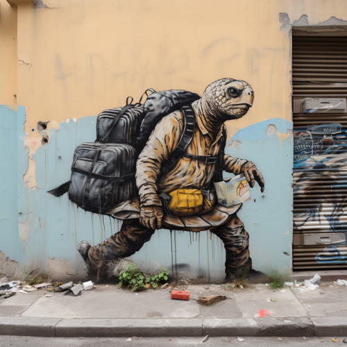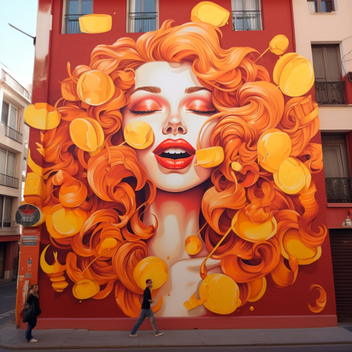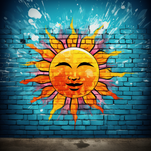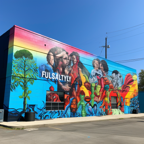 Establishing shot of a graffiti mural, in the style of Janusz Kamiński and James Cameron, god-rays, bright sunny, beautiful Vista, shot on 70 mm, 250 mm lens, long exposure, hyper realistic photography, matte, film grain, noise, rich colors, high contrast, long exposure, outdoor professional photography, detailed, elegant, depth of field, 24K, rendered, natural lighting, 2024 trending colors, modern colors, trendy colors, stylish colors, pantone trending colors 2024, vibrant colors, epic cinematic lighting, no blur, brightly lit, bright even lighting, bright lighting, pastel, hyper maximalist, vibrant colors, hd extremely detailed digital art, key visual, cover artwork, ultra-detailed, 32k, ultra wide angle, epic scene, epic perspective, epic composition, wide shot, cover artwork, epic cinematic lighting, very high detail, hdr, cinematic lighting, 8k, insanely detailed and intricate, elegant, ornate, hyper realistic, super detailed, intricate detail, HDR, extremely detailed, perfectionism, octane render, immersive, octane render, unreal engine 5, photoshopped, post-production, epic scene, Epic composition, epic perspective, epic cinematic lighting, photoshopped, super resolution, 12k, ultra hd, post-production, maximum detail, best image quality, --niji 5 --chaos 10 --ar 30:21 --s 700