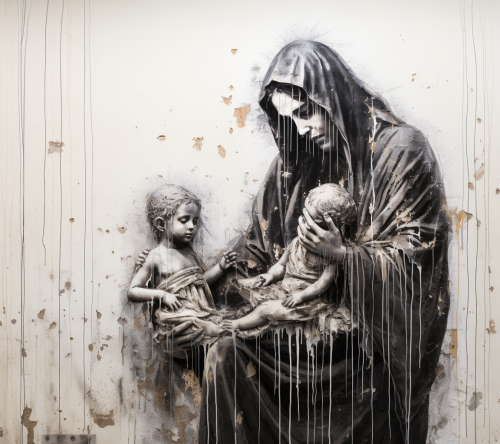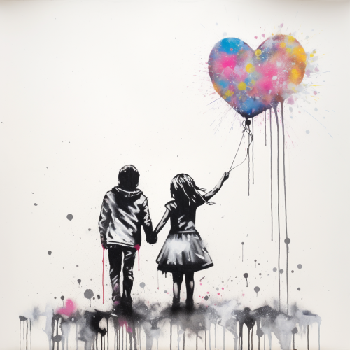 **graffiti on a white concrete wall, profile view of a big girl holding the hands of a little boy and girl, black and white, rainbow balloon, stencil art, Banksy