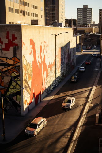 Beautiful comosition, color theory applied, sun light, shapes, lines, colors, graffity wall, downtown buildings, modern city scene, beautiful light, far, building top, highways, details, 64k, detailed, cars, traffic, riverside, big city, cinematic,leica shot, long shadows, going accorss the frame, dark shadows, moody, dramatic --ar 2:3