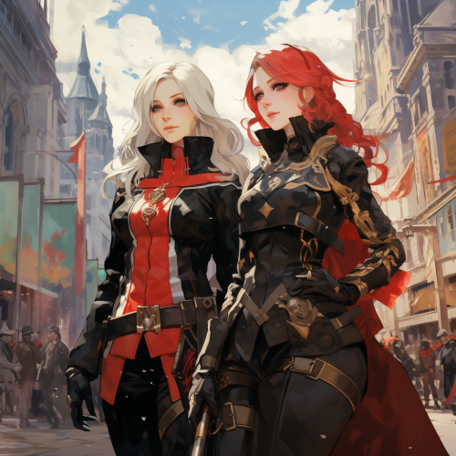Edelgard and Female Byleth from Fire Emblem Three Houses, on a date, Ice skating, winter, in the city, in the style of Erik Jones, social media portraiture, sparth, vibrant color fields, graffiti and street art, highly detailed figures, hyper-detailed