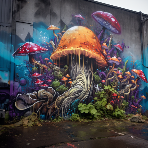 graffiti on the concrete wall: fluoriscent muschrooms, on the background is space