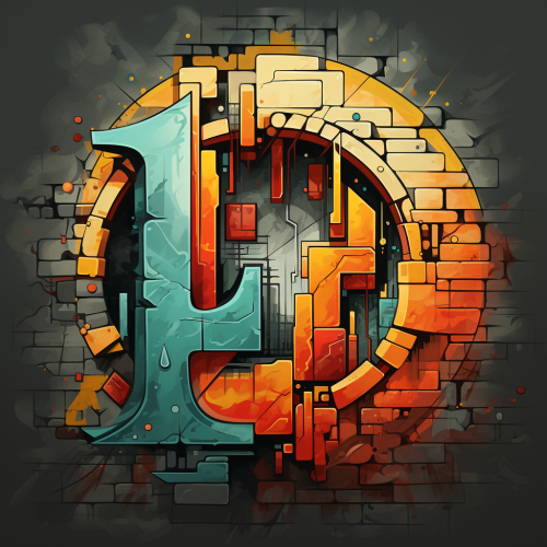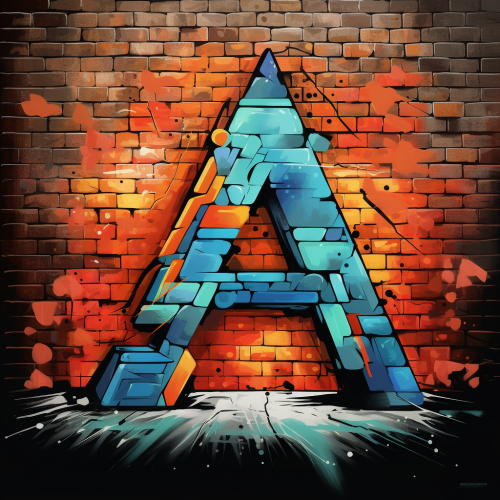 brick wall with the letter A in the middle surrounded by abstract shapes. Grafitti style.