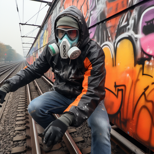 graffiti artist with mask . hanging over a bridge tagging a train. Hyperrealistic, photorealistic.
