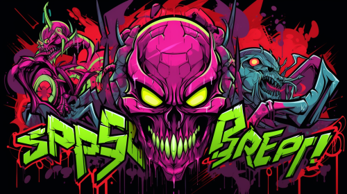 vector illustration of a stylized grafitti with text and pictures of slanesh demons from warhammer 40k, grafitti text, style of urban grafitti, transparent background, neon colors, --ar 16:9