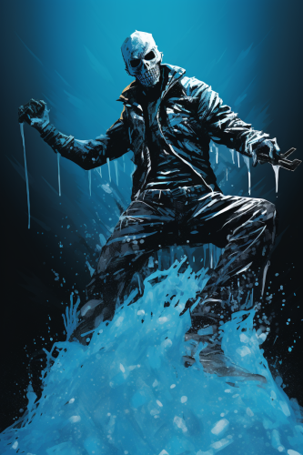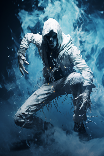 Ice executioner, wearing in hip hop style, dynamic epressive poses, full body, raw action shot, bandage, horror art, ink style, firestorn background, Symbolism, Graffuturism, Street Art Sculpture, horror cinematic, --v 5.2 --ar 2:3