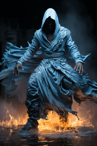 Ice executioner, wearing in hip hop style, dynamic epressive poses, full body, raw action shot, bandage, horror art, firestorn background, Symbolism, Graffuturism, Street Art Sculpture, horror cinematic, --v 5.2 --ar 2:3