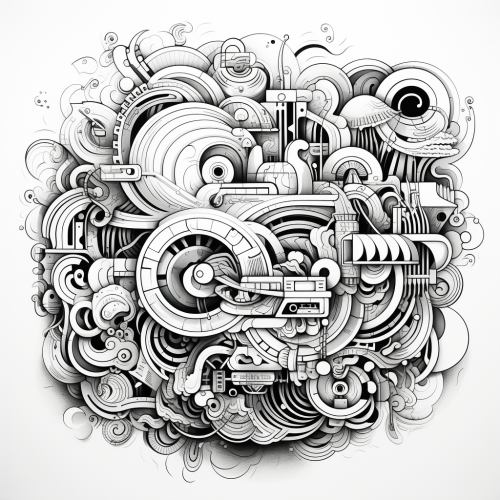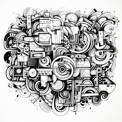 Doodle for adults, intricate, black and white coloring page, easy to color, fractal shapes, rounded geometric flow, graffiti wall style --ar 1:1