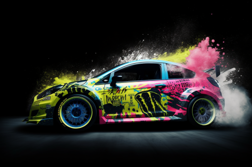 ken block hoonican style tuner car, pop art style, bold colorful brush strokes, wheelspin, smoke --ar 3:2 --v 5.0