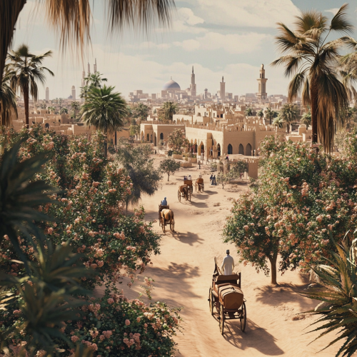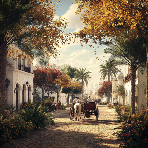 What Abu Dhabi looks like past, fascinating, 1900s, imaginative, realistic, photographic of the city of Abu Dhabi, background Abu Dhabi city view, incredible, creative, old town 3d render, horse carriages, trees, old Abu Dhabi houses, people in the 1900s, trees, winter, winter flowers