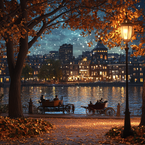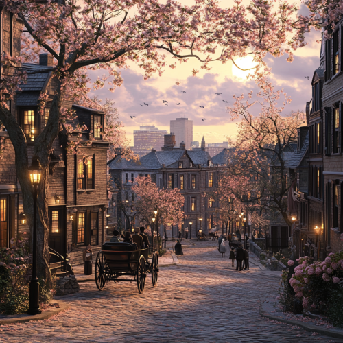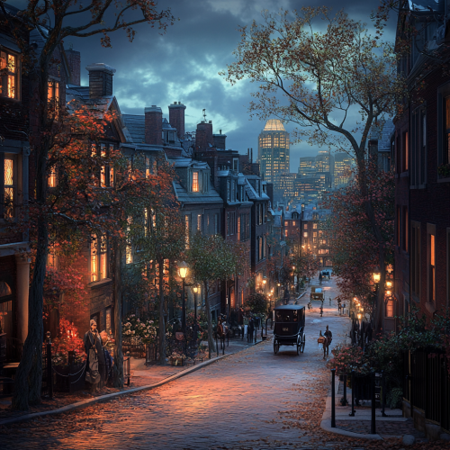 What Boston looks like past, fascinating, 1900s, imaginative, realistic, photographic of the city of Boston, background Boston old city view, incredible, creative, sea 3d render, old Boston houses, Boston people in 1900s, horse carriage, trees, flowers, night, oil lamp lights