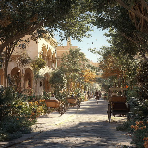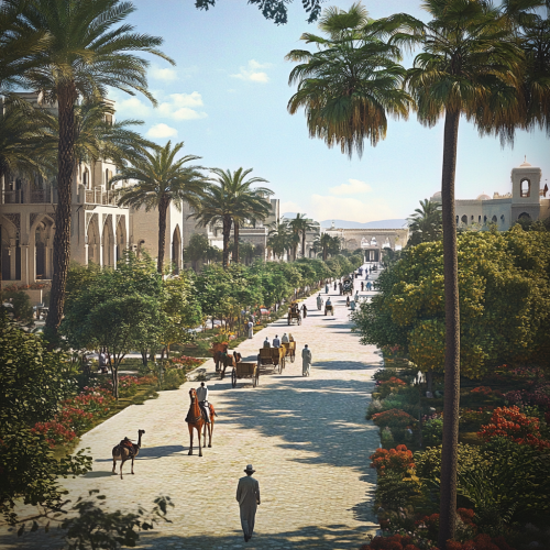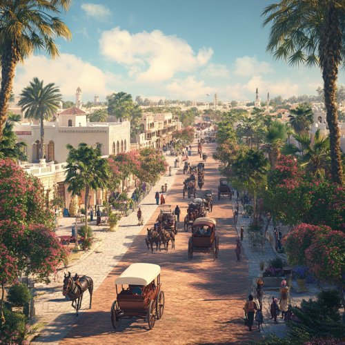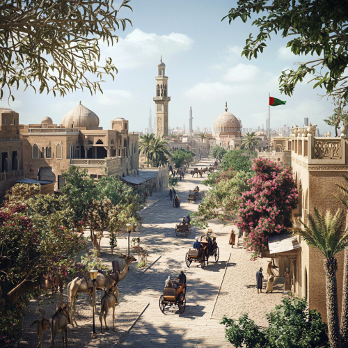 What Abu Dhabi looks like past, fascinating, 1900s, imaginative, realistic, photographic of the city of Abu Dhabi, background Abu Dhabi city view, incredible, creative, old town 3d render, horse carriages, trees, old Abu Dhabi houses, people in the 1900s, trees, summer, sunny, summer flowers