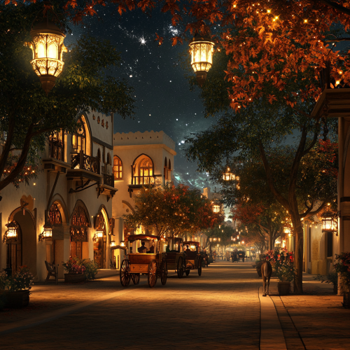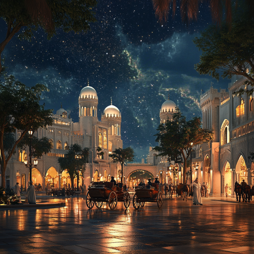 What Abu Dhabi looks like past, fascinating, 1900s, imaginative, realistic, photographic of the city of Abu Dhabi, background Abu Dhabi city view, incredible, creative, old town 3d render, horse carriages, trees, old Abu Dhabi houses, people in the 1900s, night, stars