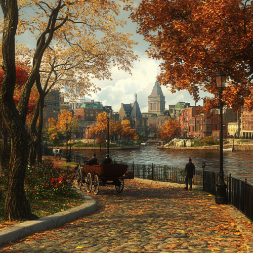 What Boston looks like past, fascinating, 1900s, imaginative, realistic, photographic of the city of Boston, background Boston old city view, incredible, creative, sea 3d render, old Boston houses, Boston people in 1900s, trees, people walking by the sea, horse carriage, autumn, yellow and red liefs, autumn beautiful flowers