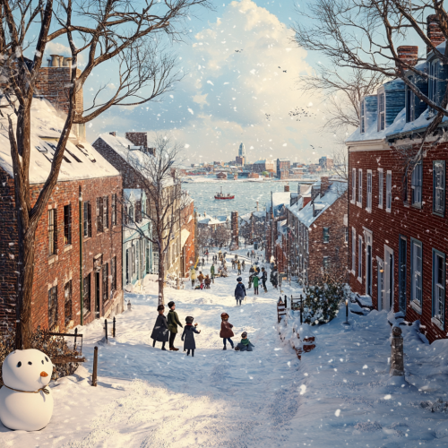 What Boston looks like past, fascinating, 1900s, imaginative, realistic, photographic of the city of Boston, background Boston old city view, incredible, creative, sea 3d render, old Boston houses, Boston people in 1900s, sun, winter, cheerful children playing snowballs, snowman