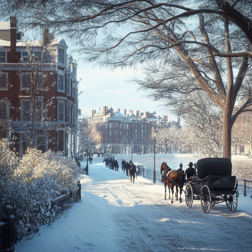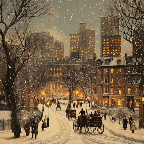 What Boston looks like past, fascinating, 1900s, imaginative, realistic, photographic of the city of Boston, background Boston old city view, incredible, creative, sea 3d render, old Boston houses, Boston people in 1900s, horse carriage, winter flowers, trees, horse carriages, fascinating ball, evening, city lights, snow detail, birds