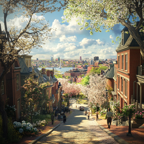 What Boston looks like past, fascinating, 1900s, imaginative, realistic, photographic of the city of Boston, background Boston old city view, incredible, creative, sea 3d render, old Boston houses, Boston people in 1900s, trees, summer, sunny, summer flowers