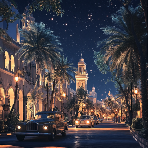 What Abu Dhabi looks like past, fascinating, 1970s, imaginative, realistic, photographic of the city of Abu Dhabi, background Abu Dhabi city view, incredible, creative, old town 3d render, trees, old Abu Dhabi houses, old cars, old bus, city lights, people in the 1970s, night, stars