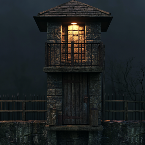 Security guard booth, medieval guardhouse with a barrier, detailed photo, spot light, realistic photo, Hollywood style, there is a modern barrier on the bridge