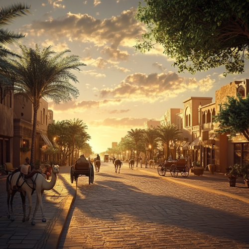 What Abu Dhabi looks like past, fascinating, 1900s, imaginative, realistic, photographic of the city of Abu Dhabi, background Abu Dhabi city view, incredible, creative, old town 3d render, horse carriages, trees, old Abu Dhabi houses, people in the 1900s, sunset, sunlight, camel carriages