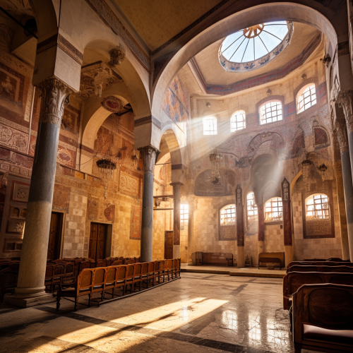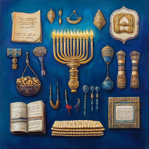 Paintings of Jewish sacred objects - the golden menorah, tefillin, tallit, tassel, mezuzah, matzoh, topuf in the word. In the style of a 2D Disney movie --s 50