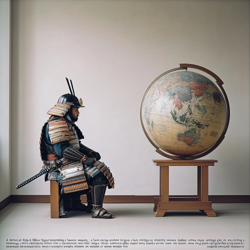 "A historical figure resembling Oda Nobunaga, a famous Japanese warlord from the 16th century, in a traditional samurai armor, intently studying a large, antique globe in a minimalistic, all-white room. The room is empty except for the globe on a wooden stand. The figure is captured in a moment of realization, with a focused expression, suggesting the discovery that the Earth is spherical. No text or additional background elements."