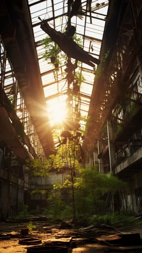 a very large abandoned factory, 19 century, big rusty hooks dangling from the ceiling, no twilight, vegetation, high ceiling, many broken windows, faint sunset light coming through the windows, eerie, creepy, highly detailed, 32k, real photo, --ar 9:16 --s 50
