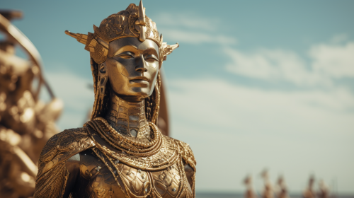 ancient golden human-like statue stands on the top of an ancient temple outside on a beach, full shot --ar 16:9