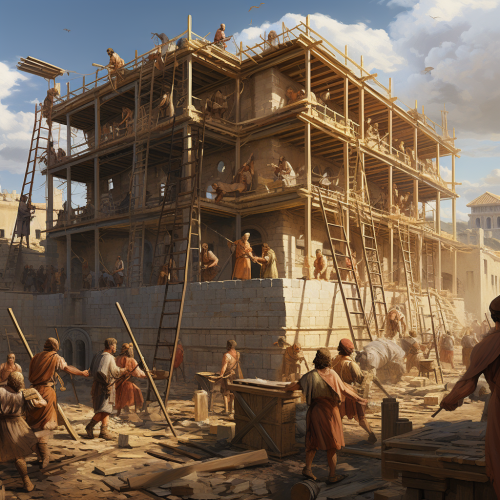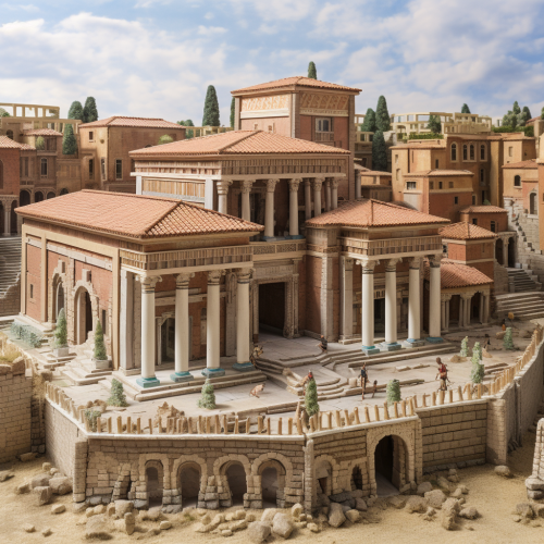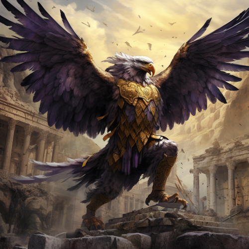 A majestic and aggressive eagle, protector of Rome, emerging from a Roman temple. He must be holding a javelin in his wing. The colours must be yellow and purple. There shouldn't be much detail.