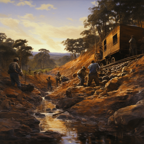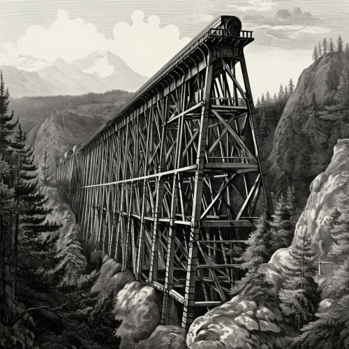 flume trestle; in the style of a simple wood engraving; 1870s