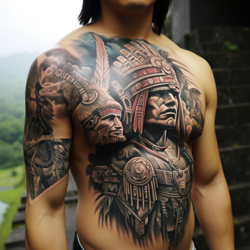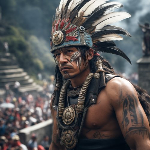 traditional Japanese style of an Aztec warrior at the top of Machu Picchu sacrificing someone's head with people watching hyper realistic 4K details on skin