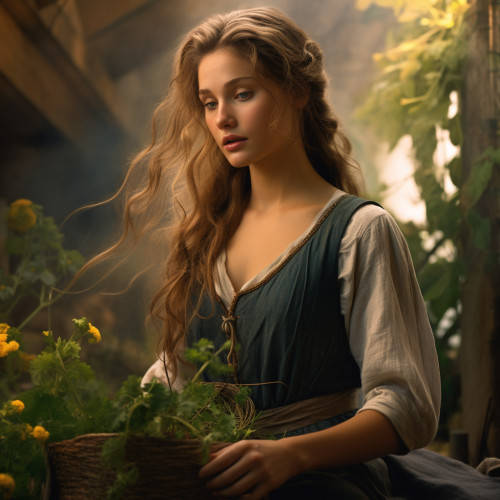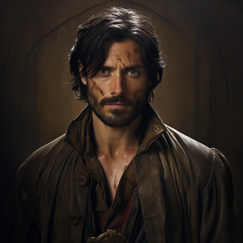 Through Alexandra Daddario's captivating eyes, the 14th-century scene comes to life. Amidst the battlefield's turmoil, the warrior woman and man exchange a passionate and intense gaze. Her piercing blue eyes reveal both strength and vulnerability, while his eyes reflect a deep admiration and affection for her. The smoke and chaos of battle only serve to highlight the raw and powerful connection between them, capturing a love that transcends the centuries, as if it were a scene from a dramatic period film, assymetrical --s 20 --ar 16:9