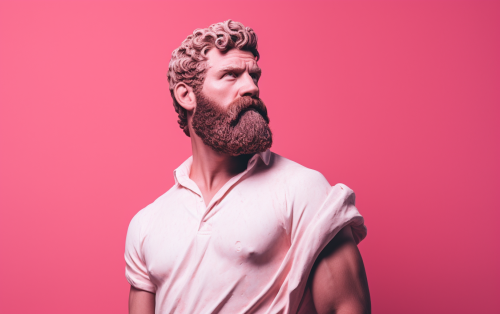 classic statue of a man, marble, wearing Occulus, strong beard, stoic, serious, studio shot, pink background, Sony Alpha A7, Shot on 50mm, f10, ISO 100 --style raw --ar 16:10