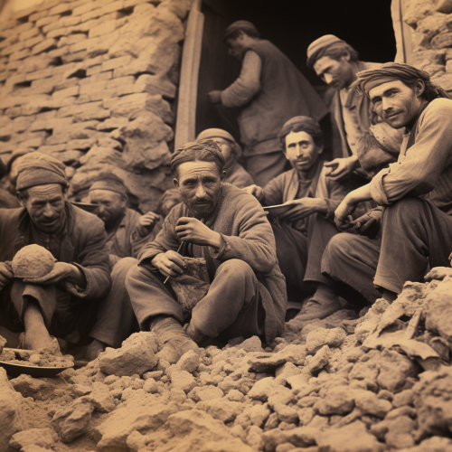 1920s photograph people in crowded conditions sitting in the dirt eating bread --v 5.2