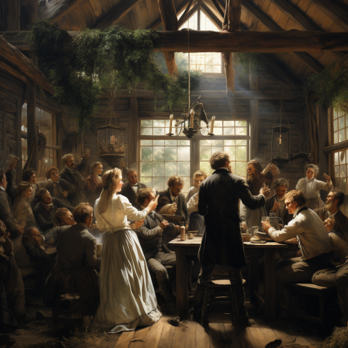 people at a wedding have become deranged, 1800's, interior of a hunting cabin