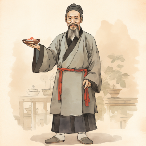 A distinguished physician from the Eastern Han Dynasty, possesses a kind and wise visage, graced with a gentle, benevolent smile. He is adorned in traditional Han-era medical attire, with a distinctive hat symbolic of a physician. In his hands, he holds ancient medical tools or herbal medicines. His posture is standing. For the background, an ancient medical clinic or a scene of him tending to injuries can be chosen. The overall color scheme should emanate a sense of age and be steeped in historical ambiance.