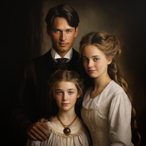 Create an enigmatic portrait of a family. Picture a teenage girl with an air of curiosity, a 9-year-old boy with a spark of imagination, a father exuding intelligence and intrigue, and a mother emanating a sense of determination and mystery. Place them in a setting that exudes an aura of historical or hidden significance, enveloped in a subtle mist. The background should hint at uncharted territories and secrets waiting to be unveiled. Infuse the image with an atmosphere that sparks the viewer's imagination and draws them into the family's enigmatic story.