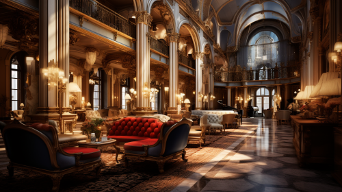 a fancy hotel lobby. use warm interior lighting inside and cold weather outside. victorian era --ar 16:9 --c 12
