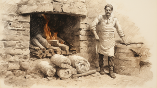 A vintage drawing of a traditional French baker with an old stone oven --ar 16:9